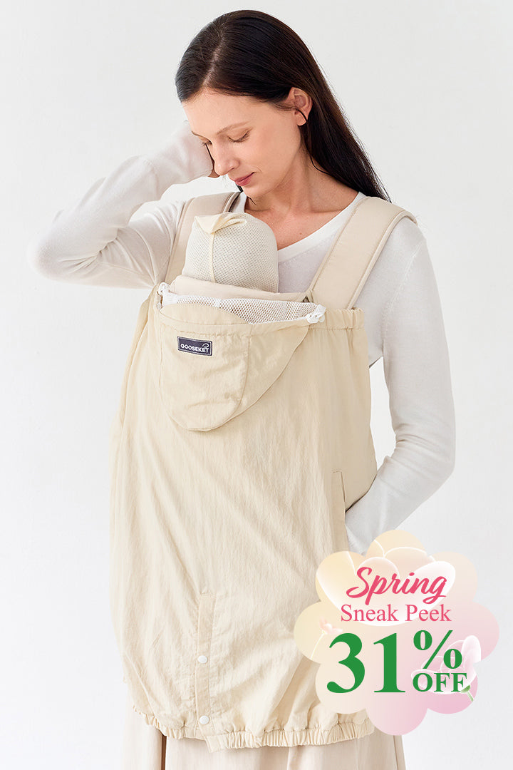 This cover really got you covered from the wind, rain, and sun. I was gifted this baby carrier cover, and it has been my go-to baby product whenever I need to shield my baby from the elements. I like that this cover has pockets since they are useful when I need to store anything away, especially when wearing leggings without pockets. I particularly appreciate that this cover protects my baby from the sun as well as from getting wet from the rain, unlike some others. Another thing I really enjoy about this cover is that it is much easier to keep clean and dry than a fabric one. I, also love that this cover can be clipped onto any kind of stroller and carrier you have and can grow with baby. one thing I would like to mention is that it is too big for a 4-month-old to wear as a jumpsuit. Also, I wish the waist strap was adjustable. all in all, I would recommend and buy this product.